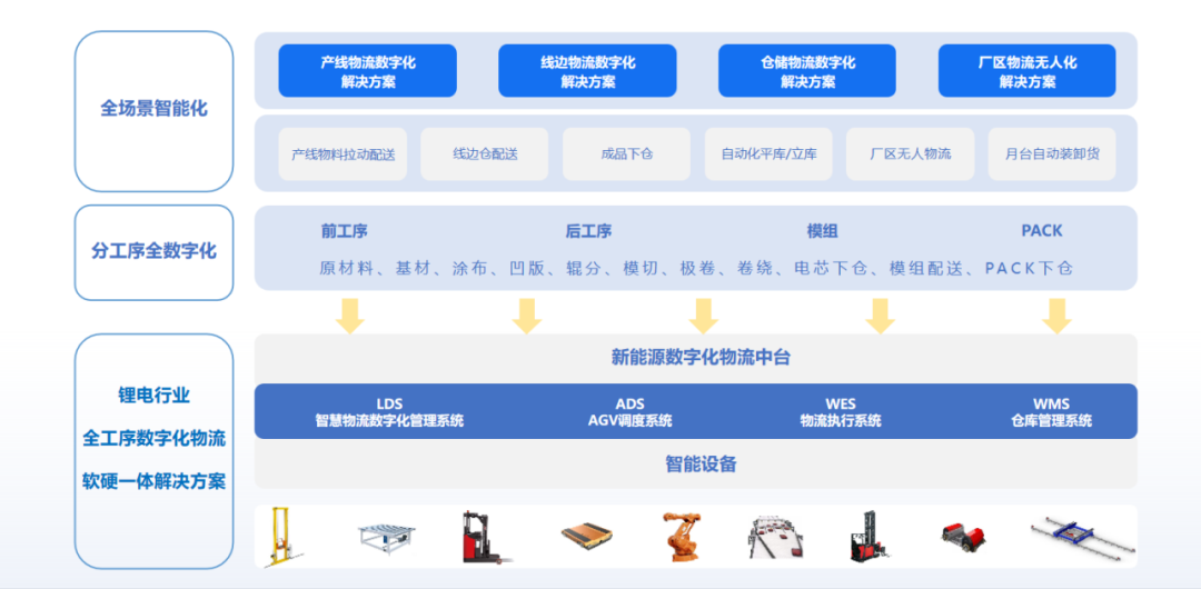 磅旗深潜锂电行业,吃透搅拌、涂布、辊压、模切、极卷、卷绕、隔离膜、电芯下仓、模组配送、PACK下仓等工序细节,深挖各工序场景,提供信息交互、物料流转、设备调度三位一体的软硬一体化整体解决方案。