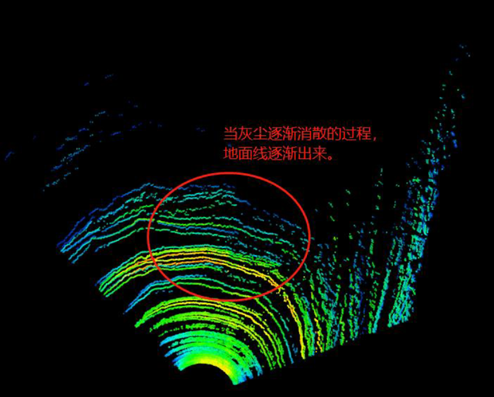 可以从点云图中看出,镭神智能激光雷达可以识别并去除大片的灰尘,减轻上位机滤除的负担;当中远处物体没有被煤灰遮挡时,仍然可以检测到中远处物体。