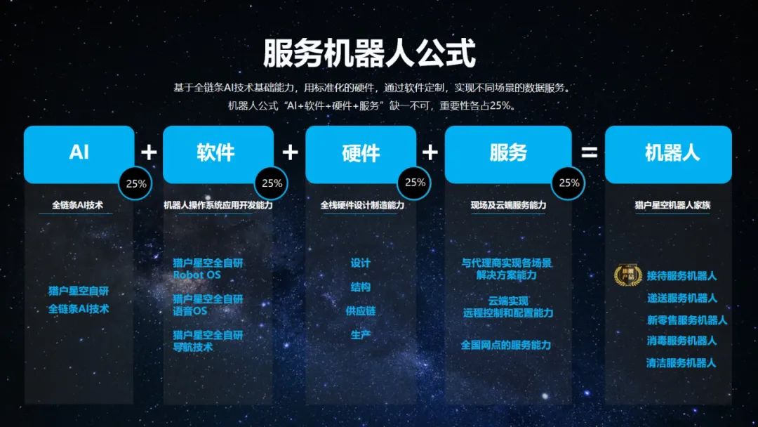 作为行业领先的“专精特新”人工智能企业,猎户星空在行业内率先提出了“AI+软件+硬件+服务=机器人”公式,独家打造了自研的全链条AI技术,拥有全自研的猎户星空语音OS和RobotOS、多传感器导航技术、标准化硬件研发体系和云端大脑服务能力,实现了软硬一体化的全栈硬件设计制造能力和全国网点服务能力,还在全自研基础上形成了“低成本、性能好和场景进入快”的三大优势。