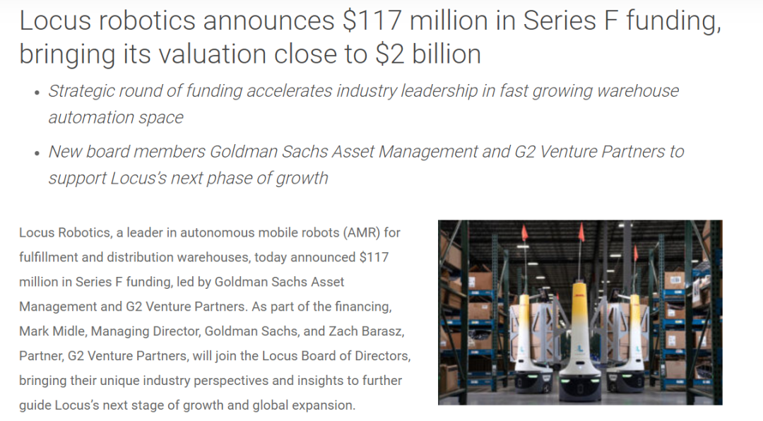 据报道,美国时间11 月 29 日,AMR机器人企业Locus Robotics 宣布完成来自高盛资产和 G2风险投资领投的新一轮 1.17 亿美元的融资,随之估值也达到 20 亿美元。