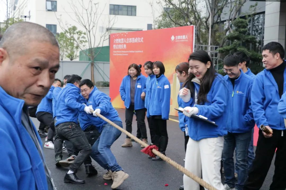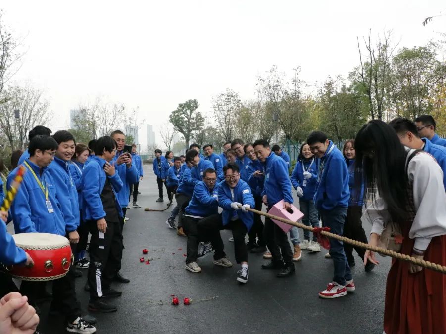 双方队员紧握着手中的长绳,弯腰扎步,齐心协力向后拔。两边加油呐喊的声音更是如排山倒海般袭来,响彻整个大楼上空,激烈的现场气氛直接将整个活动再次推向高潮。