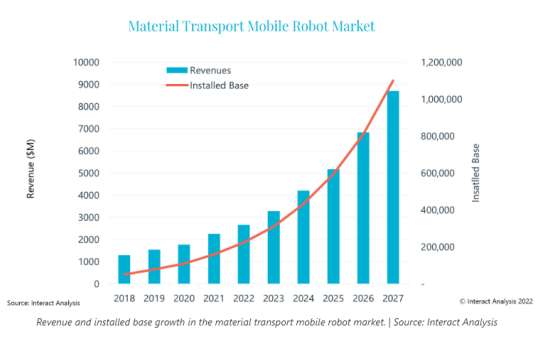 Interact Analysis发布了关于移动机器人市场增长的最新报告,其中包括自动引导车(AGV)和自主移动机器人(AMR)的销售。根据其分析,移动机器人市场在2022年的移动机器人出货量增长了53%。