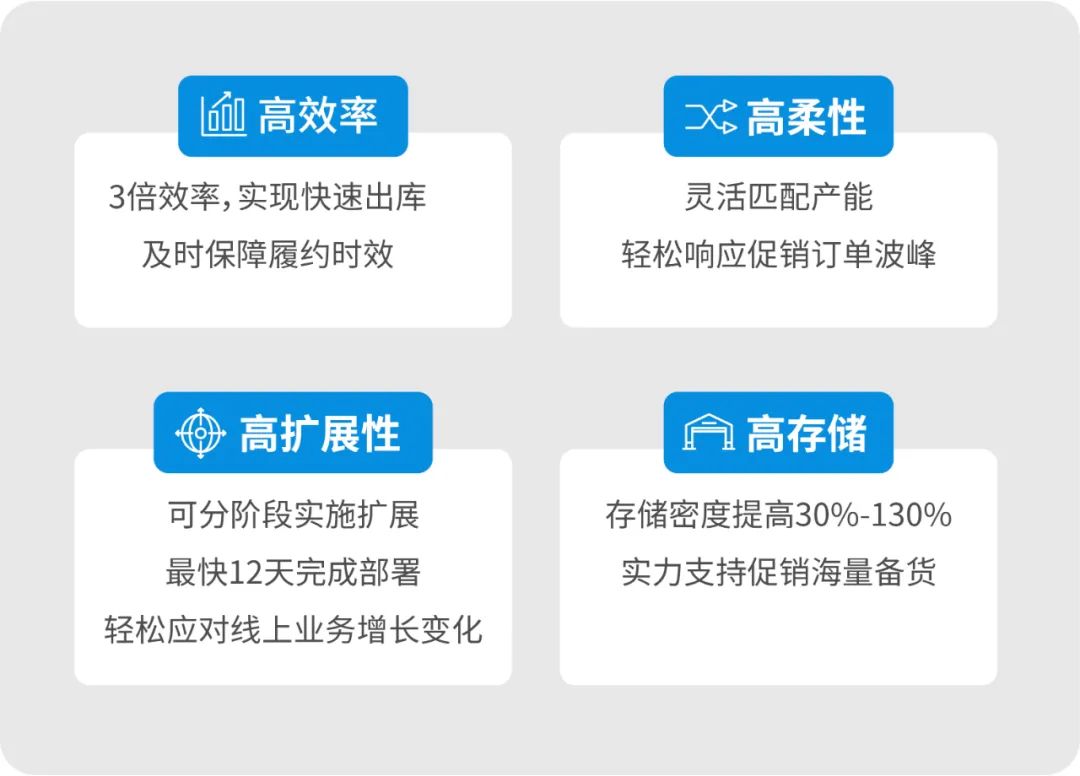 在商业环境不断变化、订单结构愈发复杂的情况下,物流机器人的价值优势愈发凸显。作为物流机器人领域的引领者,极智嘉的仓储机器人解决方案能够为电商客户带来高效率、高柔性、高扩展性和高存储四大核心价值,助力企业突破掣肘,更自信、从容地应对未知商业挑战。