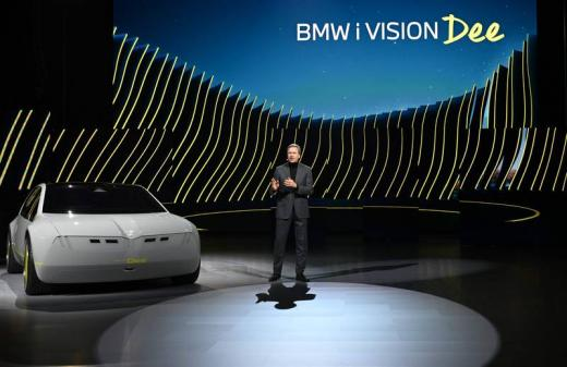 B+MW 管理委员会主席 Oliver Zipse 在 CES 期间在 i Vision Dee 原型旁发表讲话。法新社