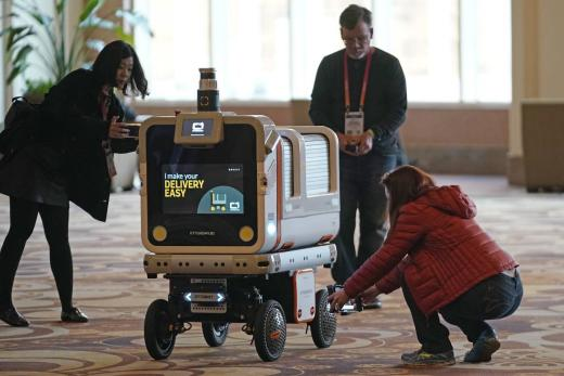在 CES 技术展开始之前,媒体成员拍摄了 Ottobot Yeti 的运行照片。美联社