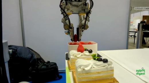 松下控股技术部展出了一款内置力传感器的机械手。他展示了一个想象处理成熟草莓的演示。