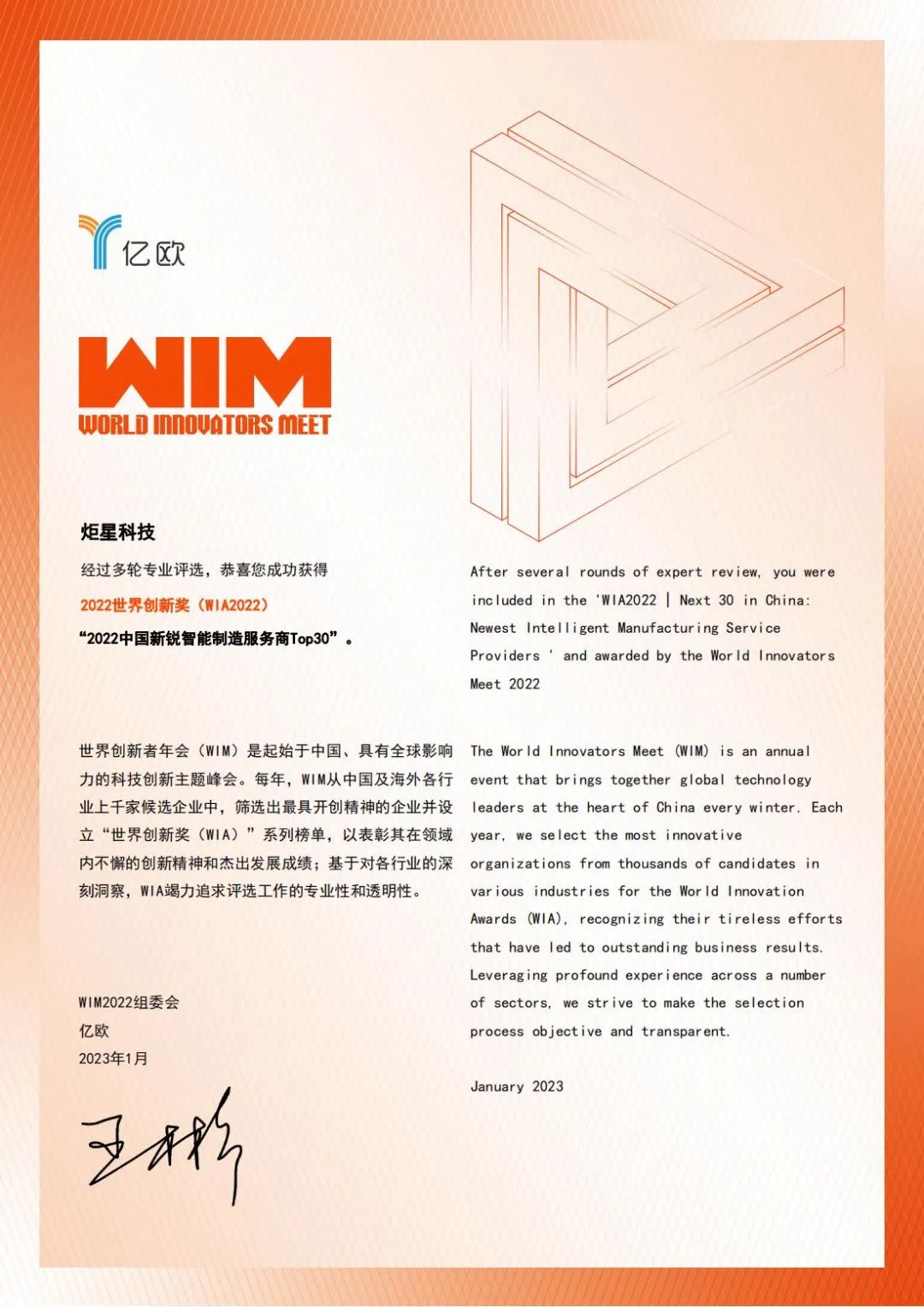 近期,由亿欧主办的中国科技界最有影响力的科技盛会——WIM 2022创新者年会正式举办,透过企业的发展脉络寻找行业出口,预测商业局势的发展。本次盛会邀请来自全各地的知名学者、投资者、行业领袖,共同讨论并评选前沿方向企业,代表创新助力中国经济的科技转型。