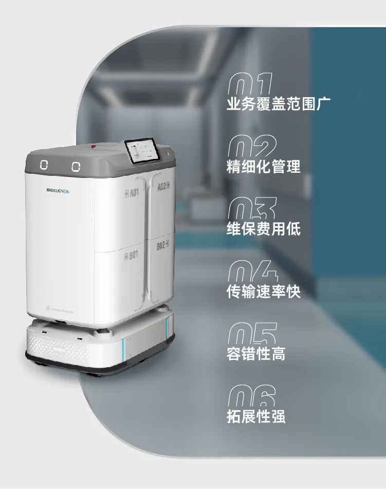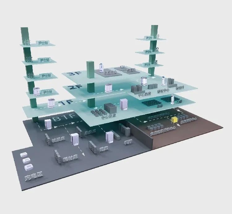 2022年,擎朗医疗数智化医院解决方案全新上线,助力医院提升物流系统的运行效率和智慧化程度。可根据医院实际场景细分化特点制订解决方案,无需预留井道站点,不占用医院空间资源,可随医院业务量变化分阶段实施,当前已广泛应用于众多医院场景。