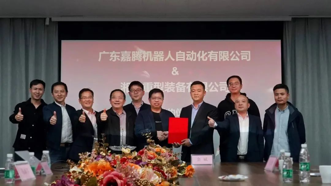 广东嘉腾机器人自动化有限公司董事长陈友先生与湘电重型装备有限公司党委书记、董事长金斌先生签约合影