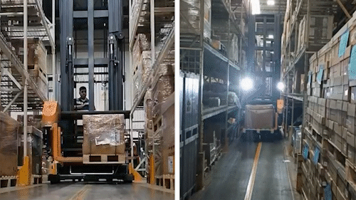 客户对人下行三向车的运行流畅度、作业效率和续航时间非常满意。无线摄像头辅助叉取货物,在作业过程中做到完全无死角,避免货叉撞击货架导致安全事故、仓库损失。