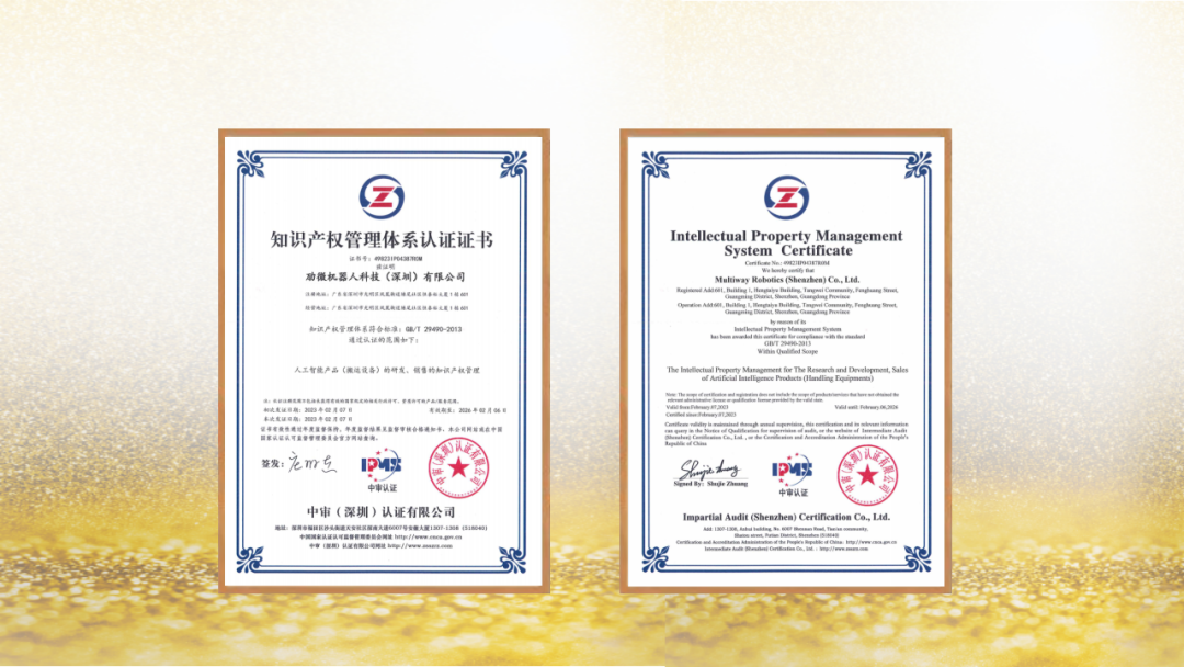 近期,劢微机器人顺利通过了知识产权管理体系(国家标准GB/T29490-2013)贯标认证,获得《知识产权管理体系认证》证书。这是劢微机器人在技术创新、技术应用转化以及知识产权规范化管理等方面取得的阶段性成果,标志着公司知识产权管理工作迈上了新台阶。