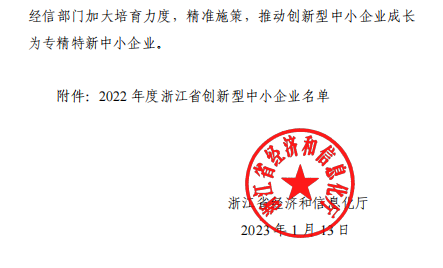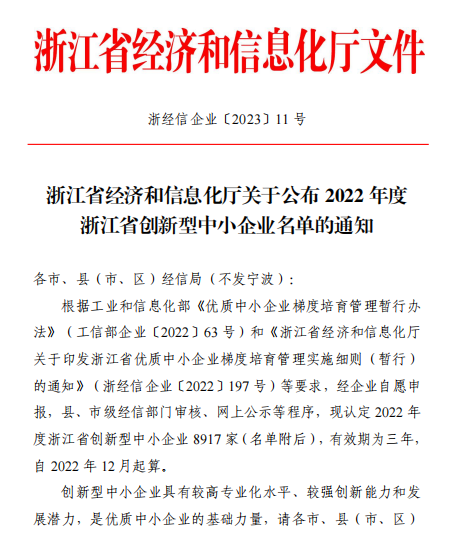 新年伊始,科钛机器人喜讯频传。根据工业和信息化部《优质中小企业梯度培育管理暂行办法》(工信部企业〔2022〕63 号)和《浙江省经济和信息化厅关于印发浙江省优质中小企业梯度培育管理实施细则(暂行)的通知》(浙经信企业〔2022〕197 号)等要求,浙江省经济和信息化厅公布2022年度浙江省创新型中小企业名单,科钛机器人被成功认定为浙江省创新型中小企业。