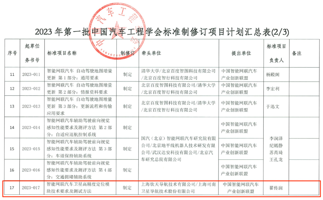 近日,由中国智能网联汽车产业创新联盟(CAICV)提出,上海司南卫星导航技术股份有限公司、上海钦天导航技术有限公司(司南导航全资子公司)联合牵头发起的《智能网联汽车卫星高精度定位模块技术要求及测试方法》CSAE标准已按《中国汽车工程学会标准(CSAE)制修订管理办法》有关规定通过立项审查,现正式列入中国汽车工程学会标准研制计划,起草任务书编号为:2023-017。