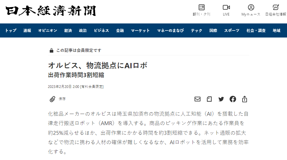 日前,日本经济新闻、LogiBIZ-Online等多家知名媒体报道了四大化妆品集团之一POLA旗下品牌ORBIS在其位于埼玉县加须市的物流基地引入了来自中国的第四代移动机器人的开拓者和引领者灵动科技旗下AMR系列产品及解决方案。