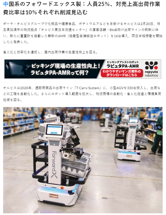 化妆品制造商 ORBIS在其位于埼玉县加须市的物流基地采用了自主移动机器人 (AMR)。采用AMR后,除了可以减少约 25% 的拣货工人外,还可以减少约 30% 的运输时间。ORBIS表示,随着在线购物的规模逐渐扩大,物流相关的人力配置变得难以保障,因此将使用移动机器人来优化流程。目前,来自中国的机器人制造商ForwardX Robotics(灵动科技)所提供的16台AMR将部署在埼玉县加须市的一个仓库中,并于20日开始全面运作。