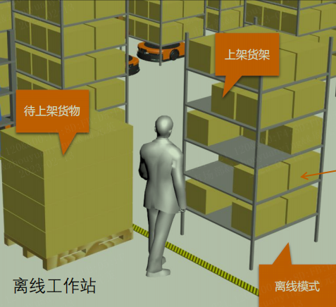 PDA离线直接上架的好处 机器人顶升货架到达离线作业点放下货架,则机器人去执行其他业务;作业人员可以进行多货架作业;作业完成呼叫机器人执行货架搬运。