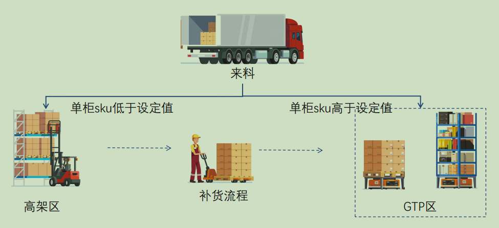 入库规则 当SKU低于设定值,品类少,数量大,入高架区,沿用现有存储模式;当SKU高于设定值,品类多,入GTP区。