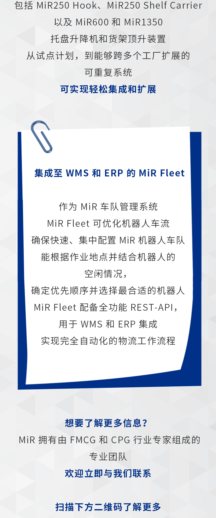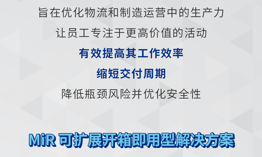 MiR致力于研发简单易用且灵活安全的机器人,帮助各类公司提高运营效率。MiR的自主机器人是新一代的先进移动机器人,具有投资回报快的特点,通常一年内就能收回成本。这些独特的协作机器人现已在工业及医疗保健行业大放异彩,帮助这些行业的制造商实现内部运输自动化。