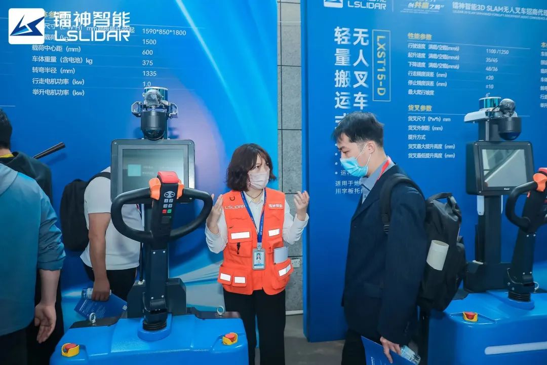 同时,为让嘉宾在现场更好的感受无人叉车的性能与应用情况,专门布置了“动态演示区”和“静态展示区”,用于展示镭神智能激光雷达3D SLAM无人叉车3D激光雷达车身部署情况,并充分了其自然定位导航、全方位3D安全防护及智能搬运能力,并配有专业解说人员为现场客户答疑解惑。其中“动态展示区”的“仓储运输模式”与“环流模式”更是引得众多嘉宾驻足观赏。