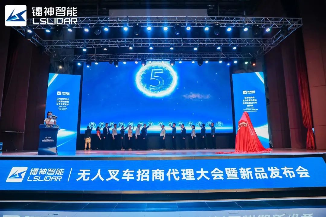 各位领导与嘉宾进行盛大启动仪式后胡总与中叉网/中国AGV网创始人胡扬波先生、移动机器人(AGV/AMR)产业联盟秘书长李进科先生、深圳市机器人协会专职副秘书长谭维佳博士,中国机器人网CEO、中国机电一体化技术应用协会智能机器人分会秘书长赵勇先生、欧能江门科技装备有限公司总经理廖其章先生等几位业内资深专家共同为本次的明星产品——镭神智能轻量搬运式激光雷达3D SLAM无人叉车揭开面纱,正式面市亮相。