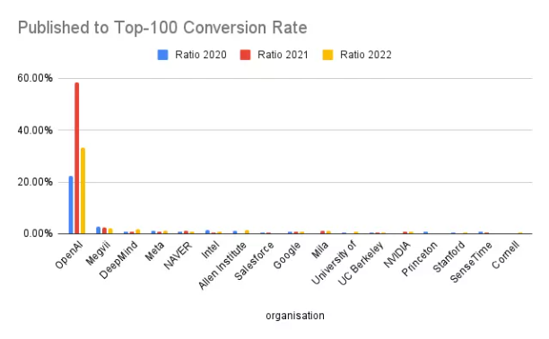 全球每年上新的 AI 论文浩如烟海,哪些机构或国家(地区)发表的 AI 论文是最有影响力的?近日,美国 Zeta Alpha 平台基于 2020 年、2021 年和 2022 年每年被引用次数最多的 100 篇论文进行了多维度的详细分析。在已发表论文高引用量转化率的排名中,OpenAI 位列第一,旷视排名第二,DeepMind 获得第三。