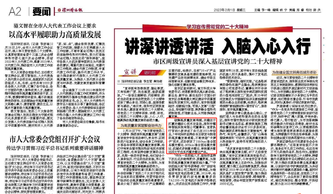 2023年2月28日下午,“学习贯彻党的二十大精神 推进深圳高质量发展”主题宣讲宝安专场活动举行。深圳市镭神智能系统有限公司董事长、CEO胡小波作为宣讲员之一,作了一篇题为《攻克“卡脖子”难题,赋能高质量发展》的宣讲,并获深圳特区报、深视新闻报道。