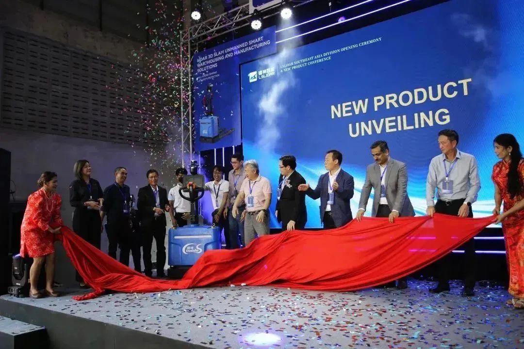 开业仪式的领导发言结束后,接下来就是万众期待的新品发布环节,各位领导带着激动的心情,上台共同揭晓这款重磅产品,这也意味着镭神智能激光雷达3D SLAM无人叉车正式在泰国亮相!
