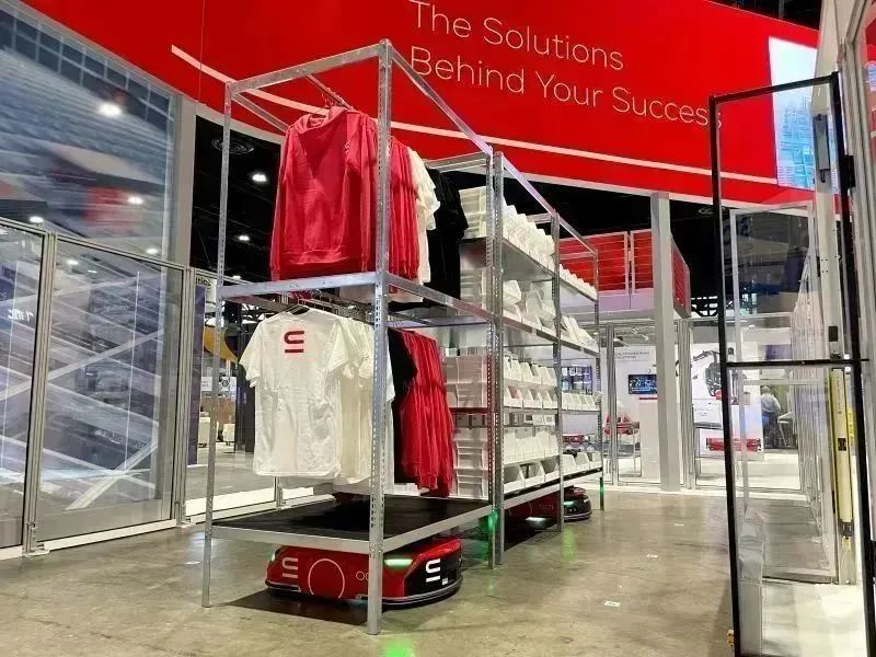 本次参展,新一代CarryPick货到人解决方案在瑞仕格展台闪耀亮相,此解决方案由四个部分组成:KUKA AMR (KMP 600P-C-U)+移动货架+拣选站+瑞仕格SynQ WMS仓库管理软件。