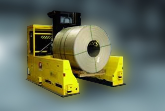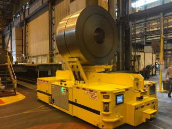 卷材运输 AGV – 该 AGV 通过内径拾取 35 吨的卷材,并将它们运送到多个下车地点中的任何一个。