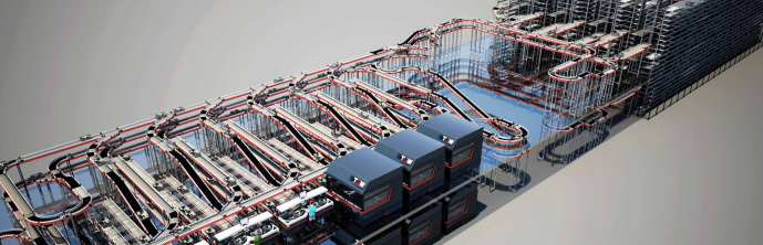 SKU 容器由穿梭车存储和检索,并通过传送带网络运送到人工或机器人拣选工作站。SKU 和订单周转箱/纸箱按完美顺序到达拣选站。拣货过程结束后,它们会自动恢复到穿梭系统中,同时订单手提箱或纸箱会被定向到装运区。