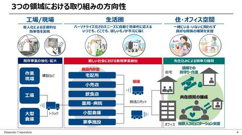松下目前正在三大领域推广其机器人相关业务:“工厂/工作场所”、“生活区”和“住宅/办公空间”。该公司制造创新本部机器人技术推广办公室总经理 Ken Ando 先生表示,“在工厂和工作现场,我们一直致力于通过与 CPS(信息物理系统)的链接来提高运营效率。我们迄今为止一直在努力。至于对市场的挑战,在住宅和办公空间,除了传统的清洁机器人之外,我们还想促进人们之间培养‘共存感’的努力。”