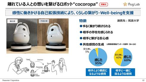 至于“住宅/办公空间”,我们将首次展出可以给您共存感的家用机器人“cocoropa ”。它应该是成对使用的,当你触摸安装在某个位置的机器人时,一只手臂会抬起,与此同时,远处的另一个机器人的手臂也会抬起。因此,当用户触摸两个机器人时,两个机器人的手臂都会抬起。远距离分居的家庭成员使用时,有“疏离感”的效果(安藤先生)。在与筑波大学的联合研究中,已经证实实际上可以获得这样的效果。