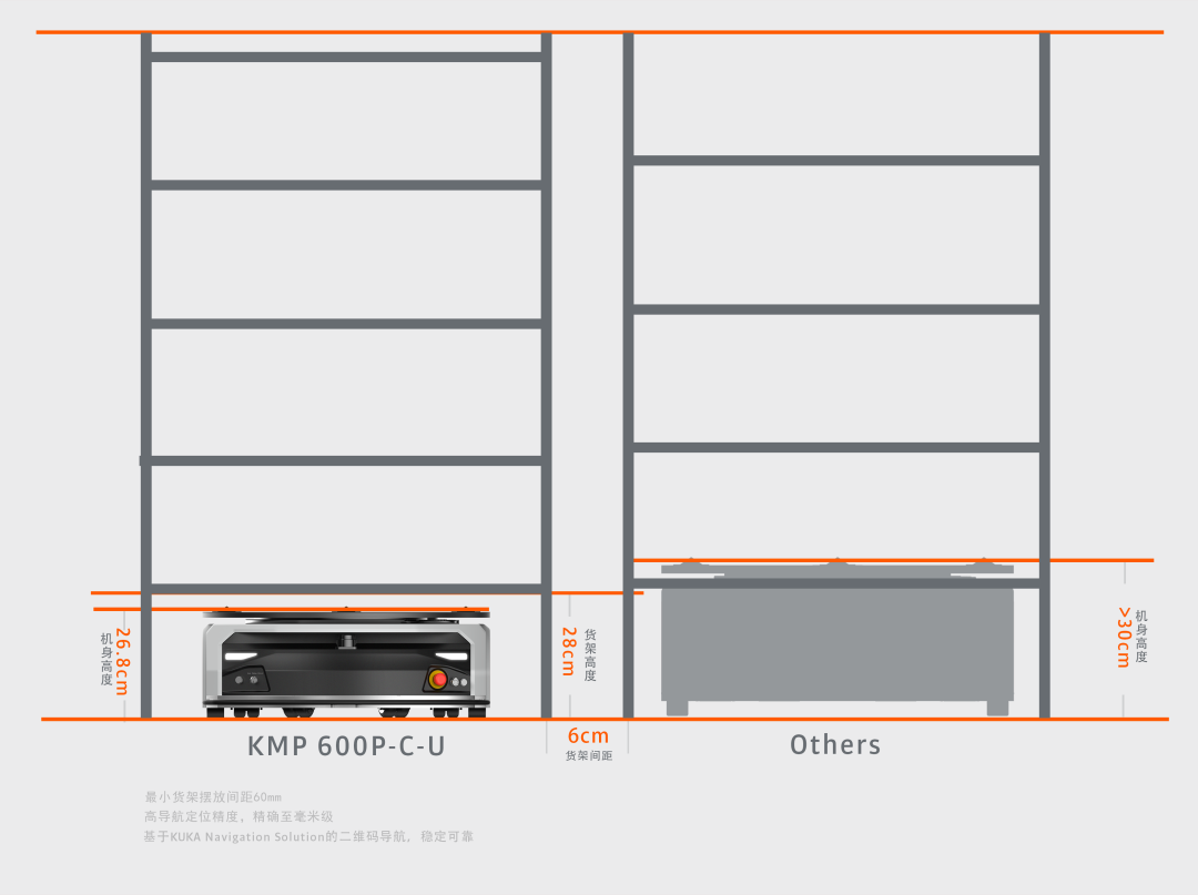 基于KUKA Navigation Solution的二维码导航技术,KMP 600P-C-U拥有稳定出色的导航系统,全面优化的运动控制精度链,可达到毫米级定位精度,具备货架摆放位置调整功能,轻松实现1.3*1.3m大尺寸移动货架的摆放间距6cm需求,为仓库赢得更多平面空间,大大增加仓库容积率,进而降低成本。