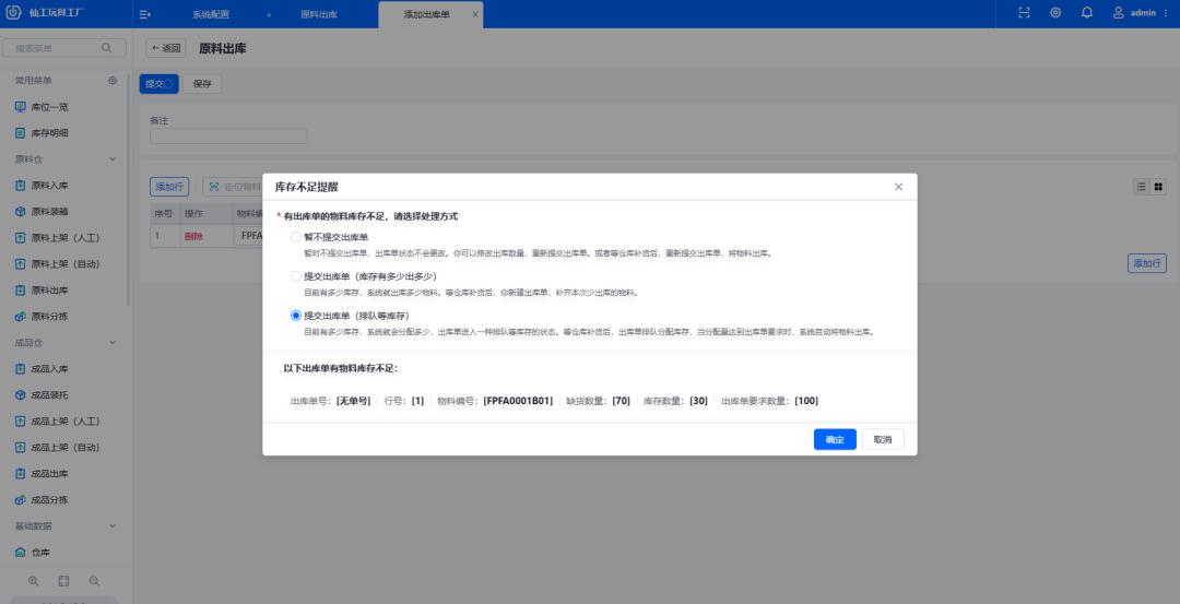 在库存分配上,除了典型的先进先出、最短距离、尾箱优先等策略,MWMS 还为制造业增加了很多优化细节。例如当库存不足时,可以直接选择阻止出库,也可以选择系统自动排队出库,不需要人工记忆和操作,规避人工找库存容易出错的风险。
