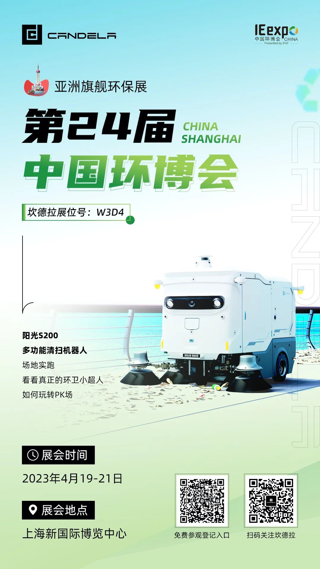 中国环博会作为我国生态环境产业一年一度最大规模的环保展,2023年4月19-21日第二十四届中国环博会将在上海新国际博览中心举办,预计吸引来自25个国家与地区的2300家参展商,同时在20万平方米展示空间内,将汇聚众多世界五百强、国央企、行业龙头、科技黑马等企业参与展示,坎德拉智能科技也将携手旗下产品——阳光S200多功能清扫机器人参加展会展示,参加以“创新助力无人驾驶 科技改变未来生活”为主题的无人驾驶环卫车辆及机器人展演,坎德拉智能科技将与福龙马、盈峰环境等企业及产品同台竞技,展现科技新力量,推动行业新发展。