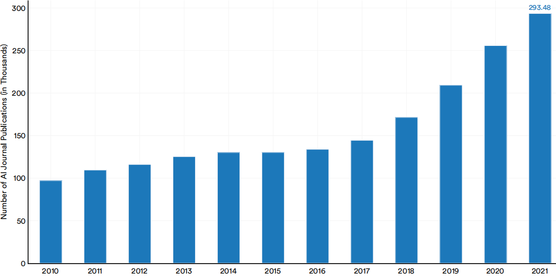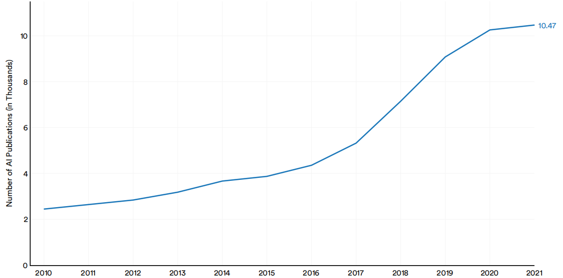 在2010年至2015年仅略有增长之后,人工智能期刊的出版物数量自2015年以来增长了约2.3倍。从2020年到2021年,它们增长了14.8%(图1.1.9)。