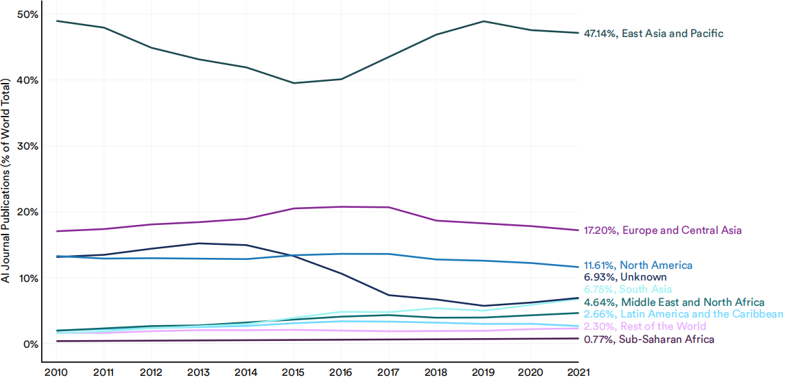 图1.1.10显示了2010年至2021年期间按地区划分的人工智能期刊出版物的份额。2021年,东亚和太平洋地区以47.1%的比例领先,其次是欧洲和中亚(17.2%),其次是北美(11.6%)。自2019年以来,来自东亚和太平洋地区的出版物份额;欧洲和中亚;以及北美也一直在下降。在此期间,来自南亚等其他地区的出版物有所增加;以及中东和北非。