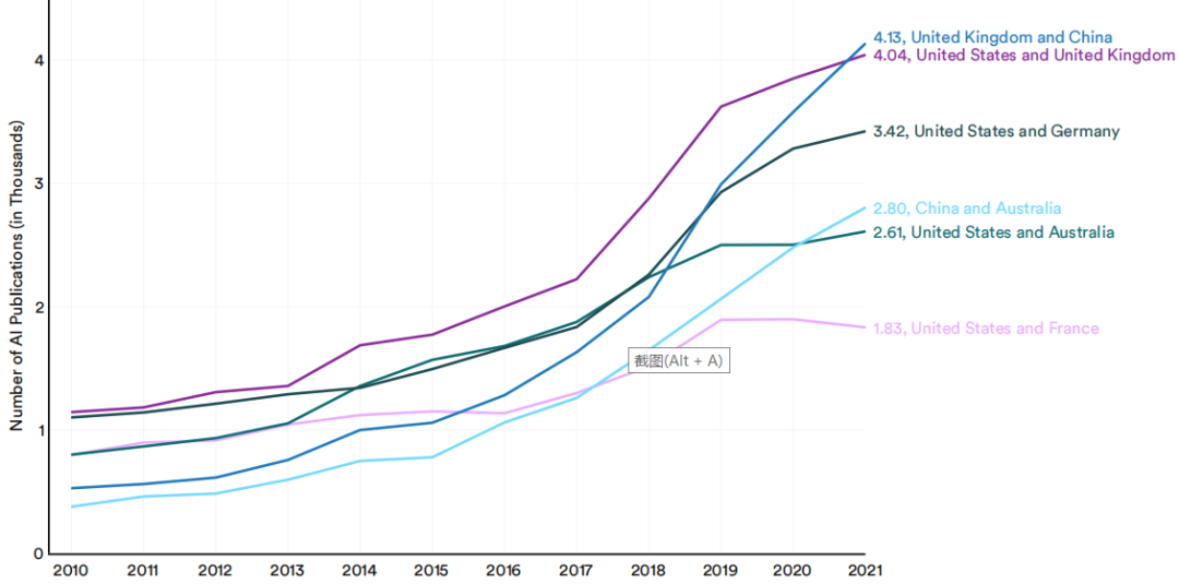 学者、研究人员、行业专家和其他人士之间的跨境合作是现代STEM(科学、技术、工程和数学)发展的关键组成部分,它加速了新想法的传播和研究团队的发展。图1.1.6和1.1.7描述了2010年至2021年期间最热门的跨国人工智能合作项目。CSET将跨国合作计算为每个出版物的作者之间的不同国家对(例如,单一出版物上的4名美国和4名中国附属作者被视为一个U.S.-China合作;同一作者之间的两篇出版物被视为两次合作)。