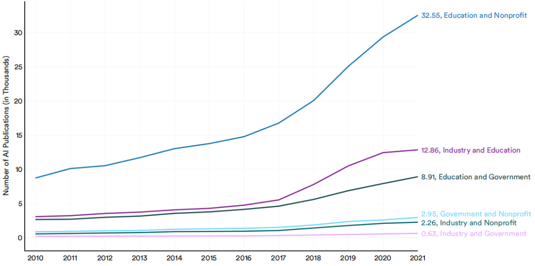 学术界以外的人工智能研究的增加扩大并扩大了各个部门的合作。图1.1.8显示,2021年教育机构和非营利组织(32551)合作次数最多;其次是工业和教育机构(12856);教育和政府机构(8913)。教育机构和工业之间的合作增长最快,自2010年以来增长了4.2倍。