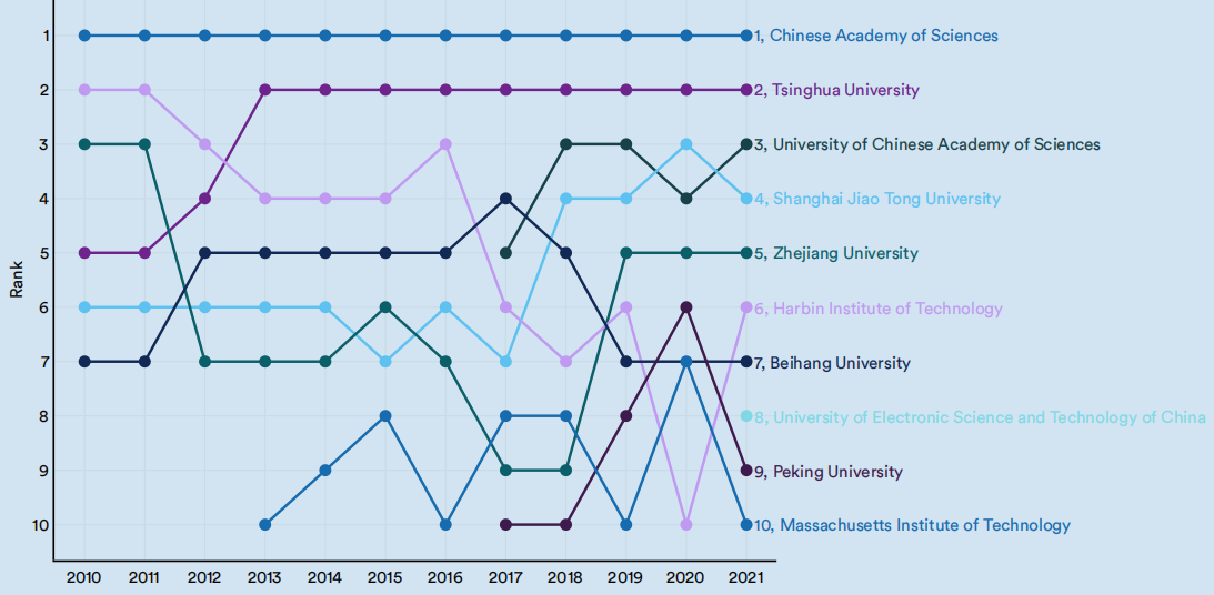 2010-21年,按各领域的人工智能出版物数量排名,2021年世界十大机构