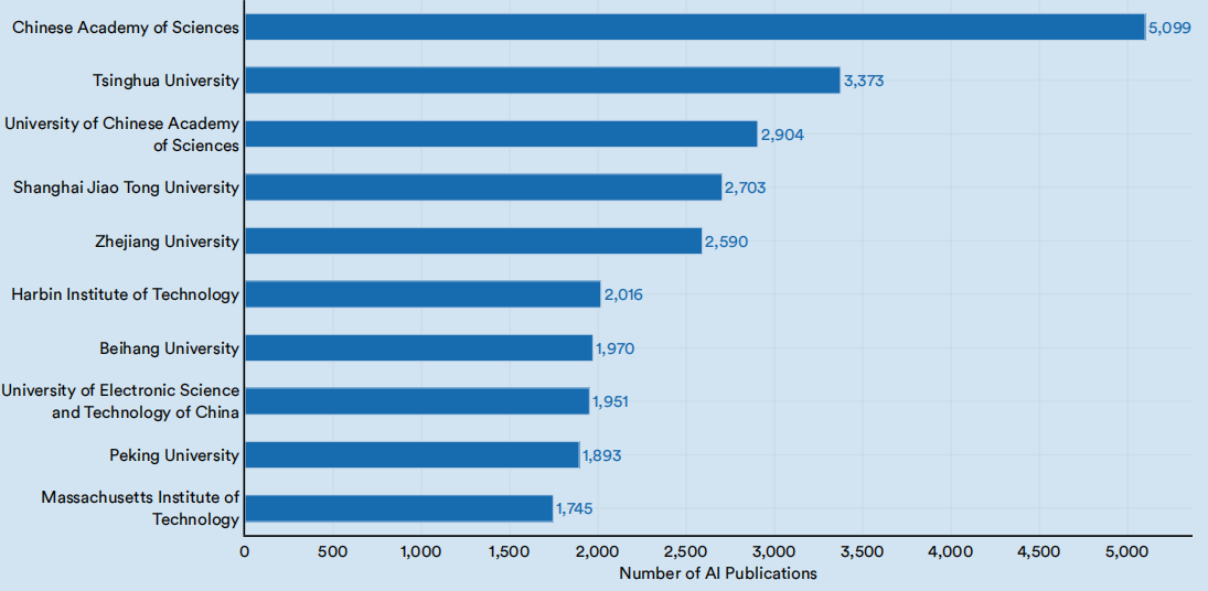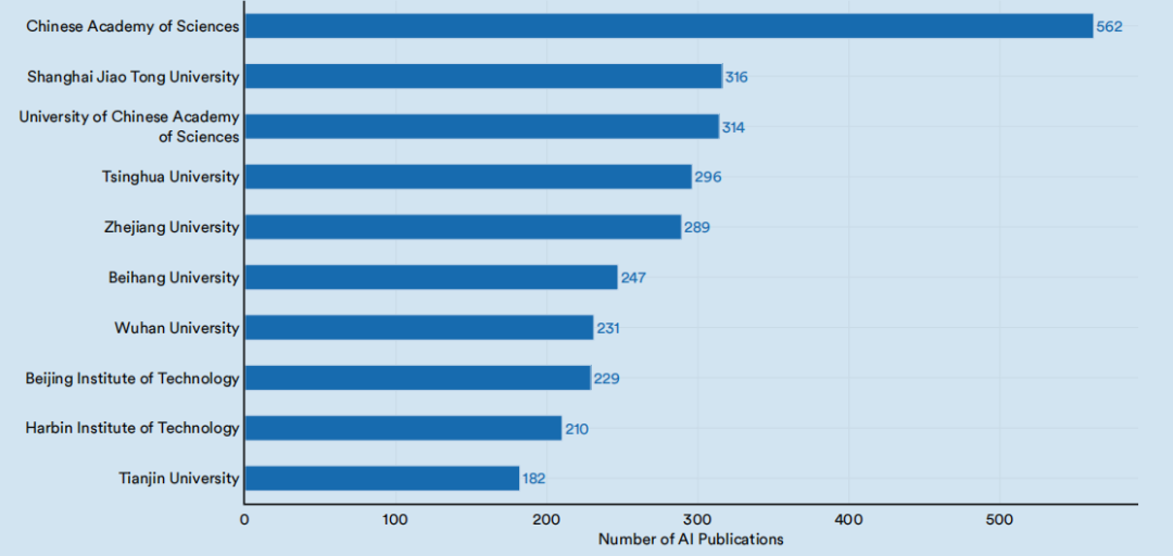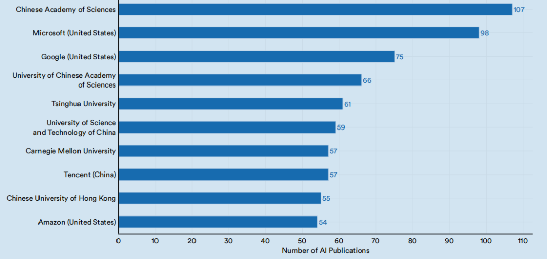 自2010年以来,产生人工智能论文总数最多的机构一直是中国科学院(图1.1.21)。排名前四名的都是中国大学:清华大学、中国科学院大学、上海交通大学和浙江大学。这些机构在2021年发布的出版物总数如图1.1.22所示。