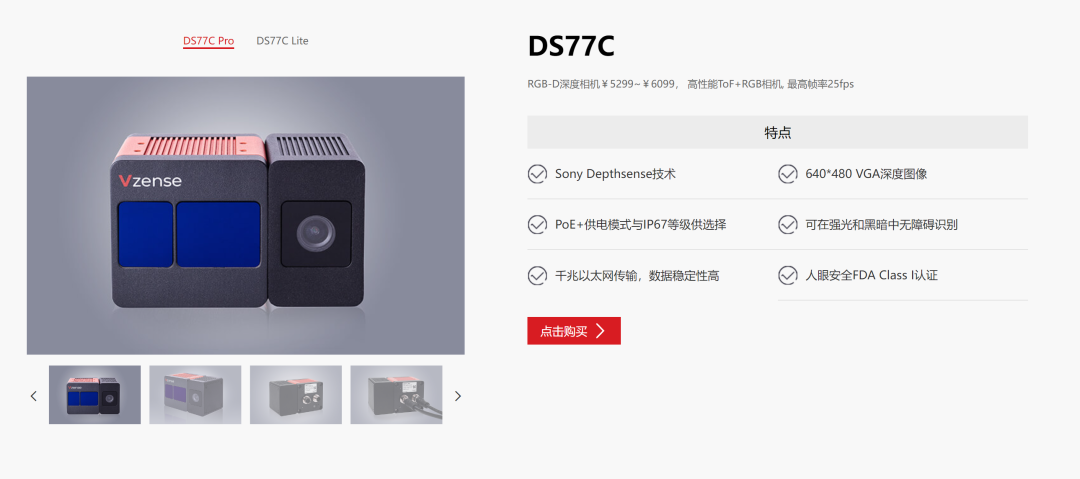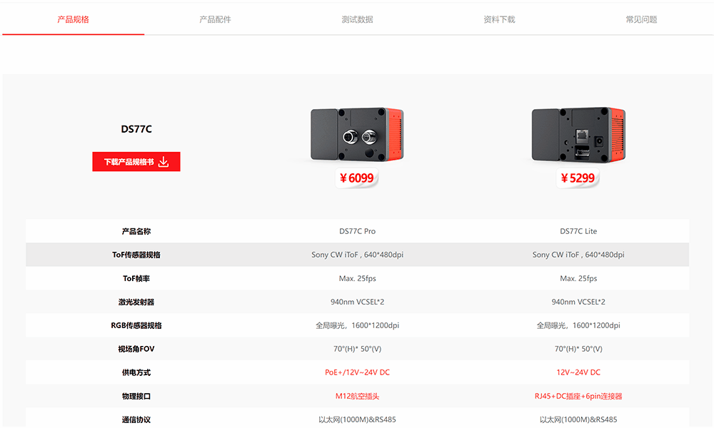 | -带有200万像素的RGB Sensor, 可用于同时需要RGB信息的场景中 -MicroUSB接口,即插即用,配合Vzense图形化工具,可快速上手使用 | -基于工业应用场景打造的ToF Only模组,具有高分辨率,高精度,高可靠性的特点 -多种角度和接口可按需选择 | |