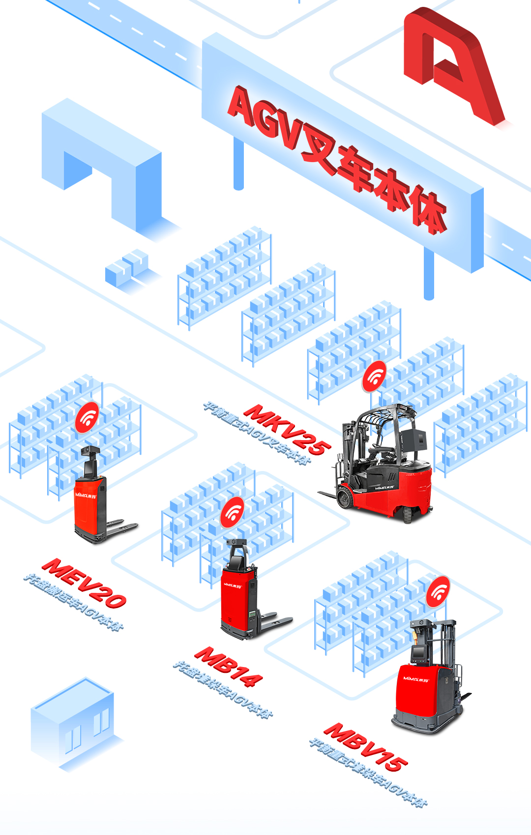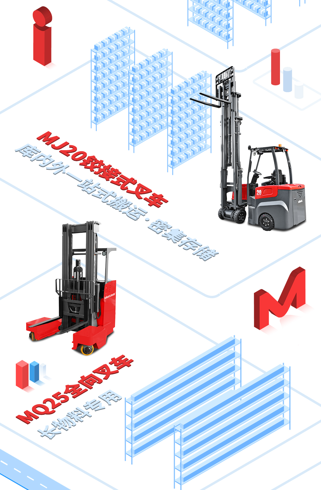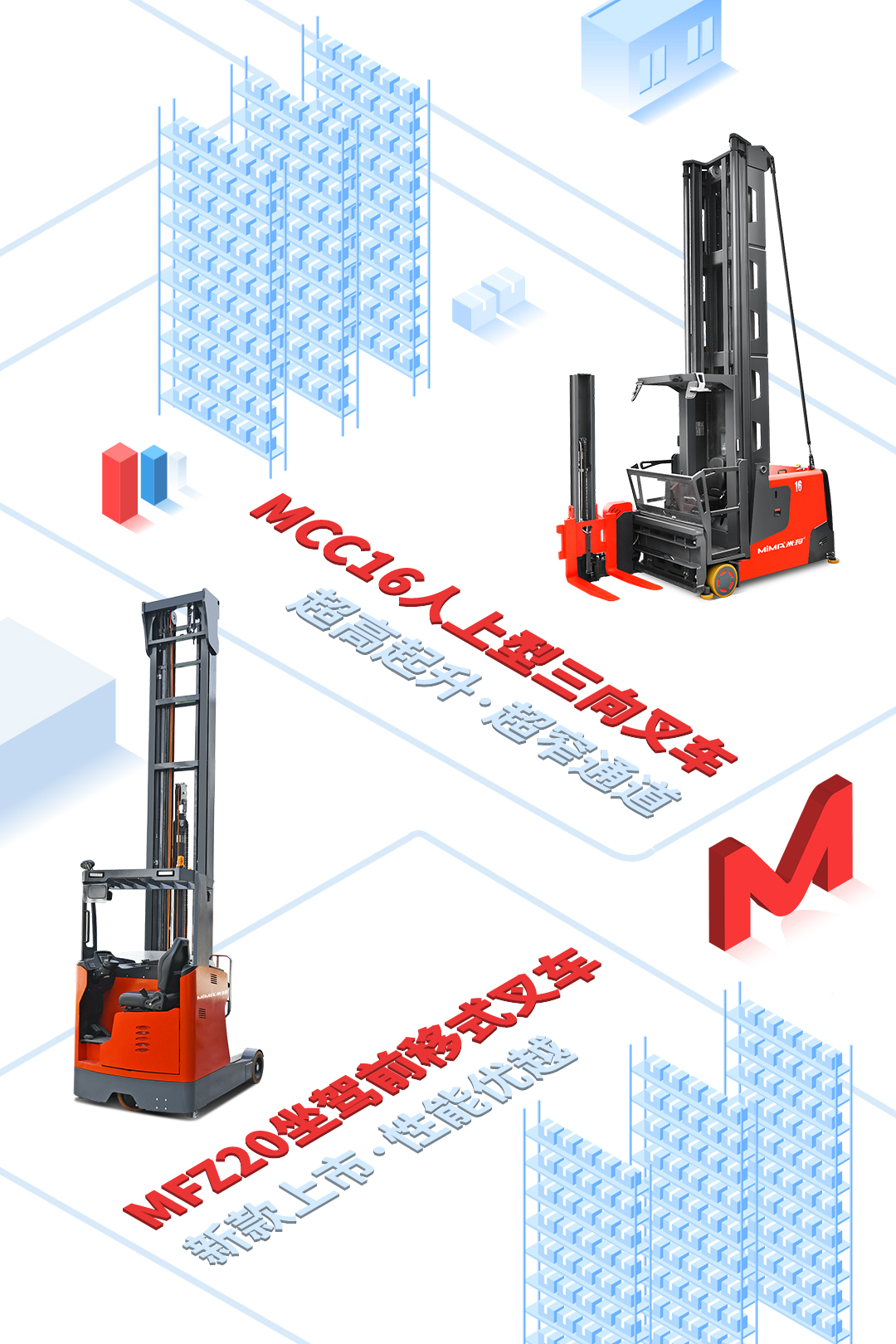 二十多年不断进取, MIMA 品牌以公司强大的科研创新团队为依托,以“安全、耐用、舒适、低碳(环保)”为设计理念,为客户提供500KG —100000KG应用解决方案、仓储设备及 相关服务。 通过不断的技术创新和专利积累,现在我们的产品已涉及12大类50多个品种,如电动托盘车搬运车、托盘堆垛车、前移式叉车、平衡重式叉车、牵引拖车、拣选车、窄巷道叉车、四向叉车、侧面叉车和非常物流设备、AGV、无人巷道堆垛机等等。产品广泛 应用于医药、食品、化工、电子、机械、家具、物流等各个行业。