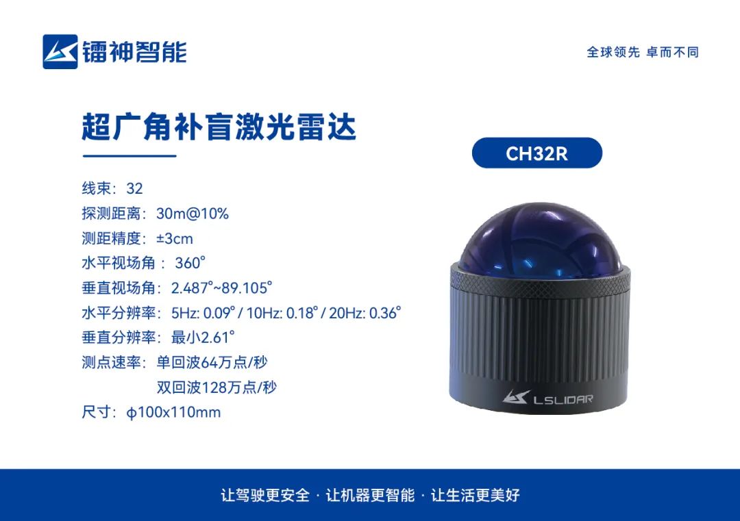 镭神智能于2023年新推出两款超大视场的新品激光雷达:C32W大视场机械式激光雷达,拥有360°x 70°超大视场角,测点速率可达64万点/秒;与CH32R超广角补盲激光雷达,具备360°x90°超大视场角,测点速率为64万点/秒。两款超大视场的新品激光雷达保障了充足的扫描范围,大大缩减探测盲区空间,实现全放位立体防护、定位导航,可适用于无人叉车、AGV、AMR、机器人等应用场景。