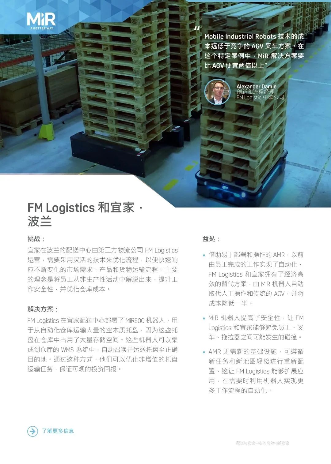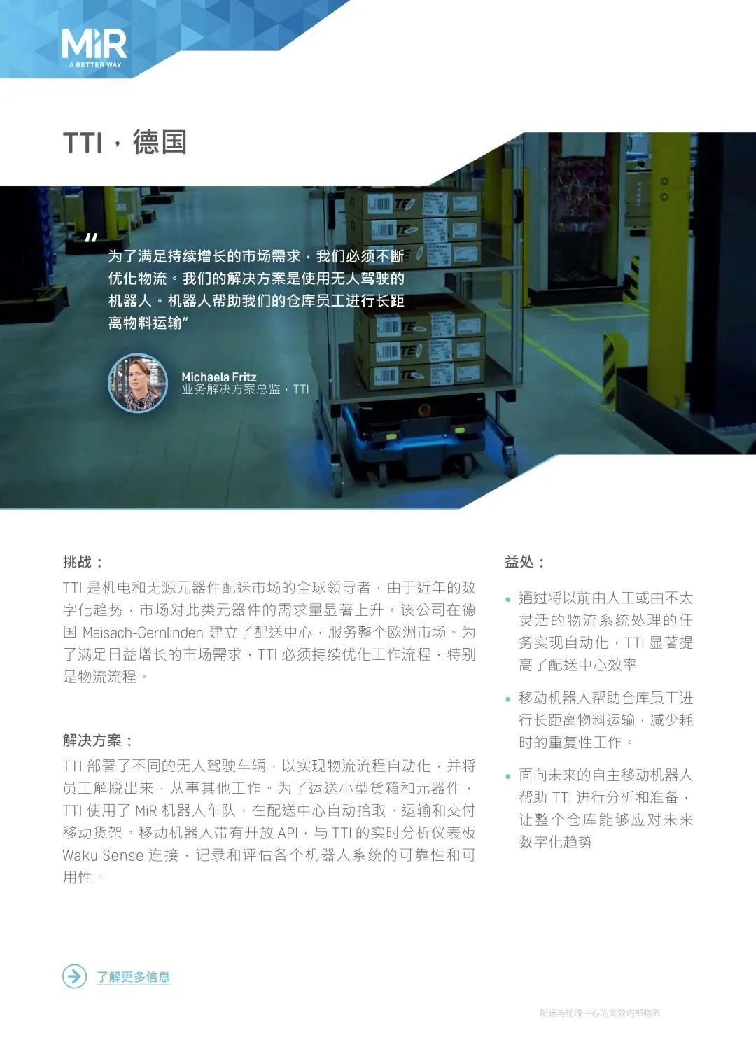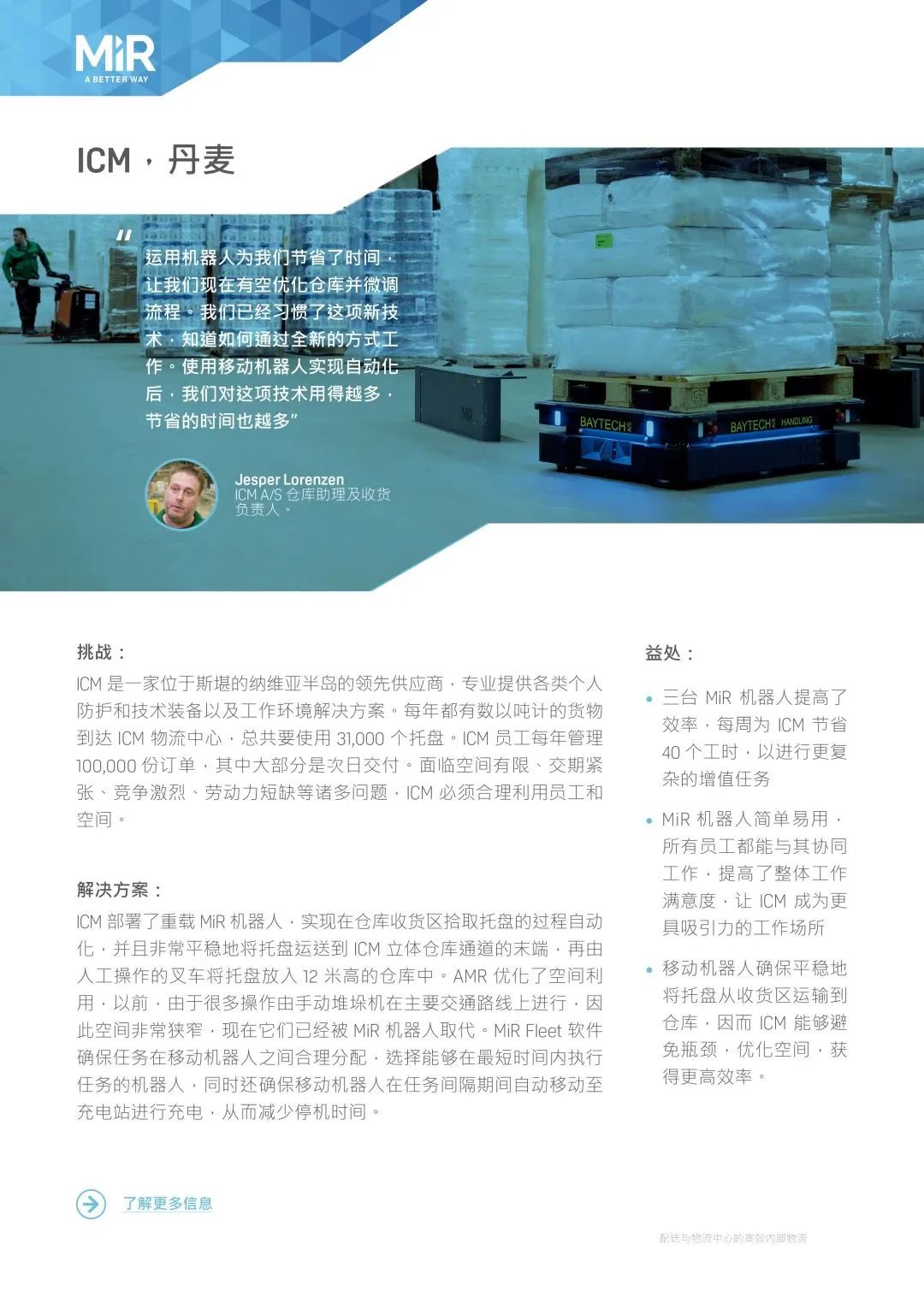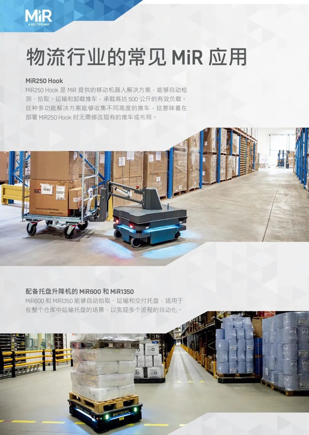 MiR致力于研发简单易用且灵活安全的机器人,帮助各类公司提高运营效率。MiR的自主机器人是新一代的先进移动机器人,具有投资回报快的特点,通常一年内就能收回成本。这些独特的协作机器人现已在工业及医疗保健行业大放异彩,帮助这些行业的制造商实现内部运输自动化。