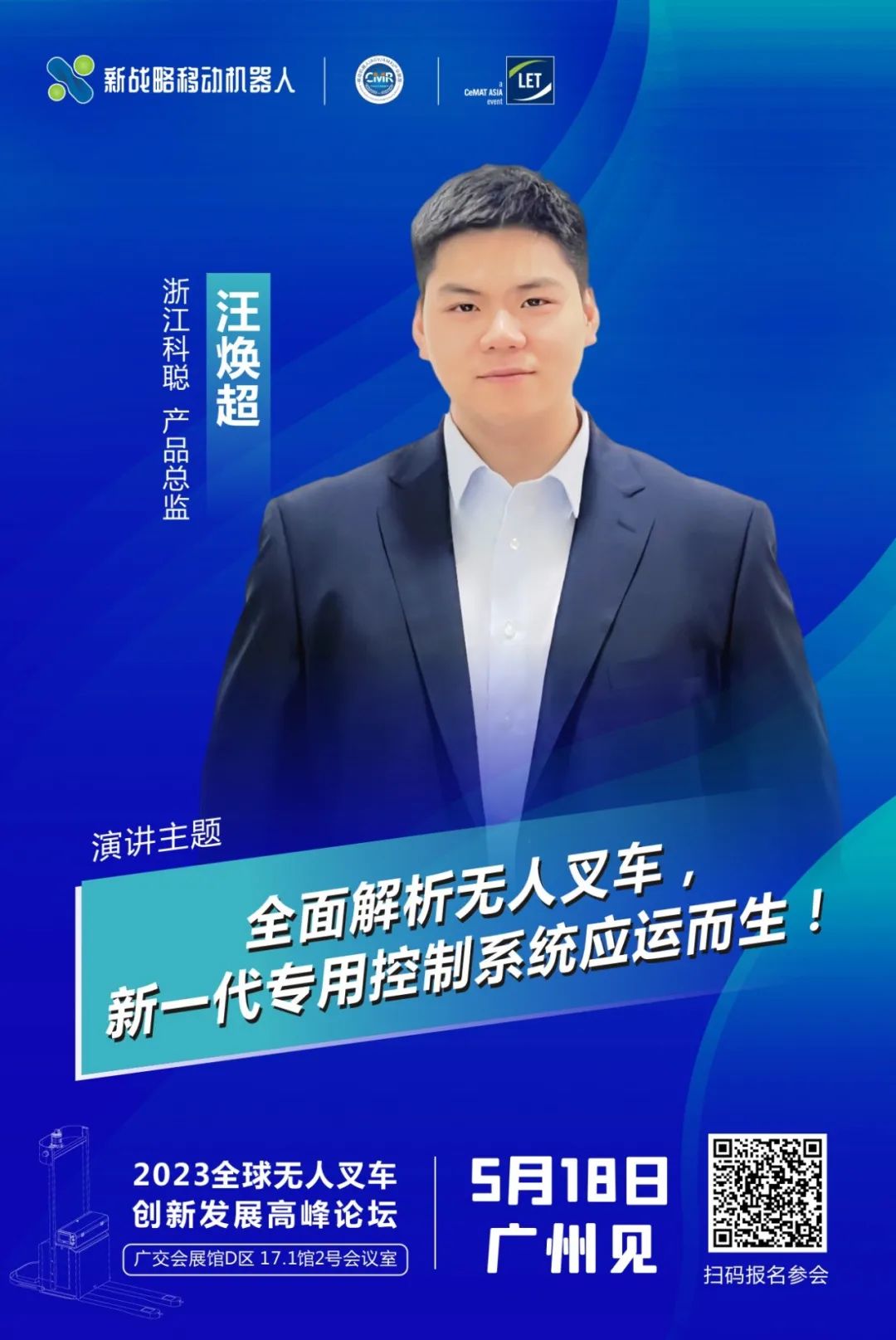 在于广州物流展会同期同展馆举办的2023全球无人叉车创新发展高峰论坛上,科聪产品总监将以《全面解析无人叉车,新一代专用控制系统应运而生!》为旨做主题演讲,对科聪新一代专用控制器进行深入探讨和分享。