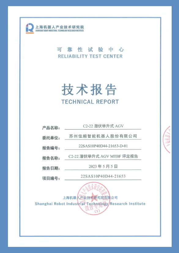 近日,佳顺智能移动机器人标准产品之一的潜伏举升移动机器人获得了MTBF(平均无故障时间)2000小时(按照24小时不间断运行为83天)认证。这是对我们产品品质和可靠性的巨大认可,也是我们不断追求卓越的成果。