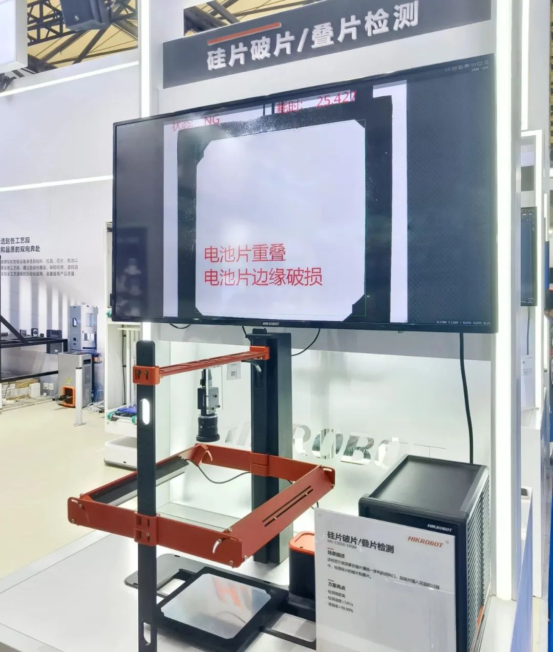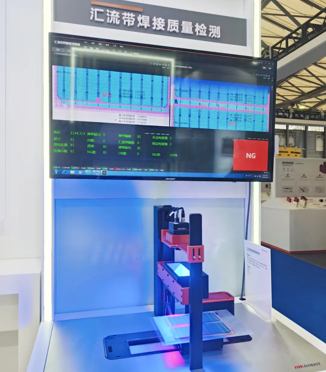 汇流带是光伏电池的重要的部件,检测需求包括焊带偏移、焊疤面积、焊带未剪、焊带超出、焊带搭接等十余项,对此海康机器人开发了汇流带视觉检测模组,架设速度快,调试简单,性能稳定,适应不同场景的流水线,该模组由2K线阵相机及专业定制光源组成,成像清晰,目标突出,一图到底,无缝衔接,同时结合海康机器人成熟的AI算法,对上述缺陷和尺寸进行严格的质量把控,检测速度快、准确率高,已在多个客户工厂落地实施,为每一块电池板保驾护航。