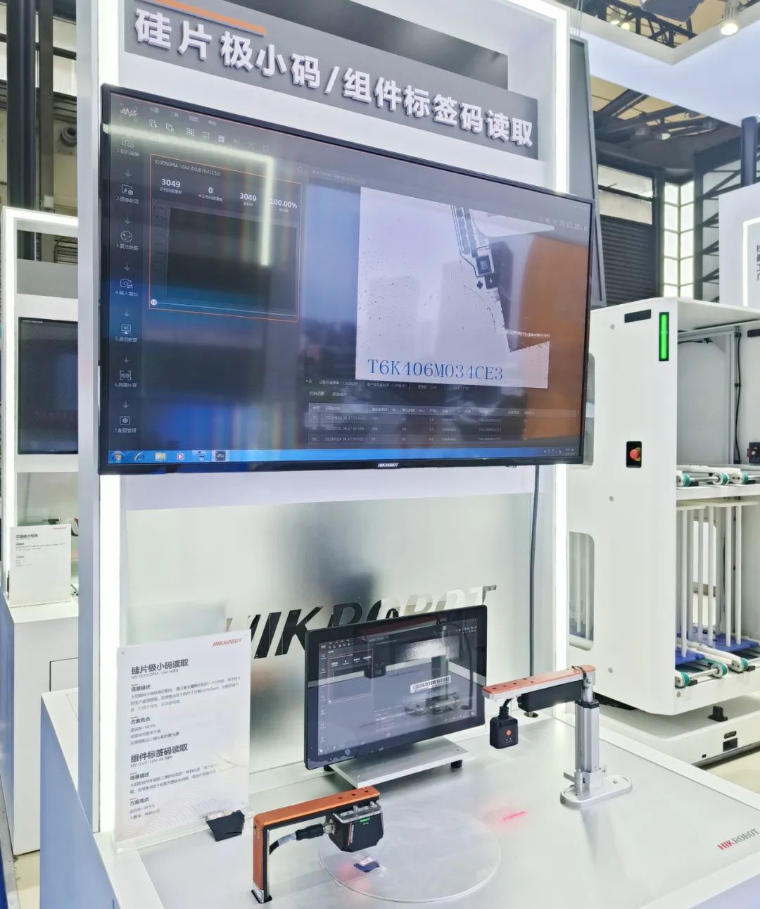 太阳能硅片由硅棒切割后,会通过高精度激光镭雕机打上一个边长为0.6mm的DM码,用于追溯产品工位的生产情况。传统远心镜头方案架设空间大、机构设计复杂,海康机器人推出极小码配件方案,可在狭小空间自由安装、快速调试,且保证极小码的稳定读取,无需搭配远心镜头和外置光源。该方案可有效应对硅片镀膜前工序的极小码读取需求。