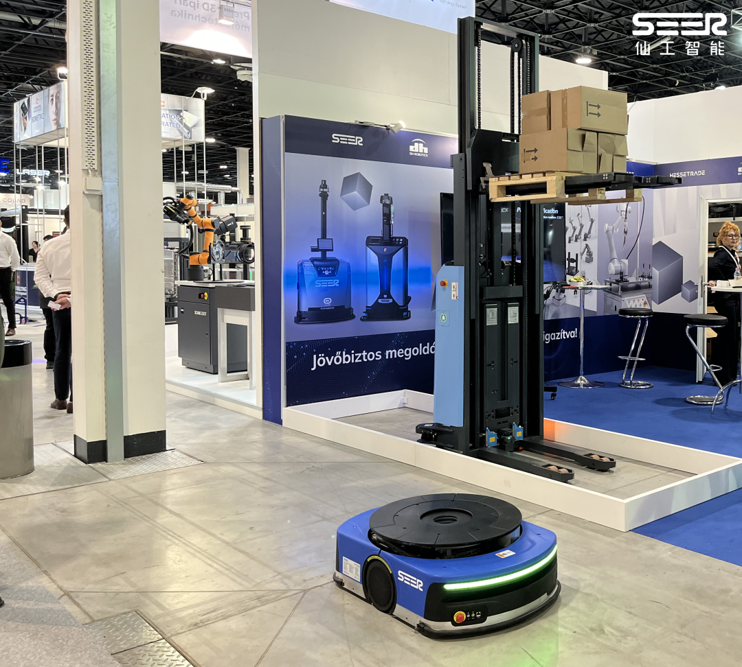 5 月 16-19 日,匈牙利合作伙伴携仙工智能标准产品出席匈牙利国际工业展览会 ipar napjai,动态产品包含 CE 款小型堆高式智能叉车 SFL-CDD14-CE 和旋转顶升搬运机器人 AMB-800K,静态产品展示包含 2023 新款地面式智能叉车 SFL-CBD15。